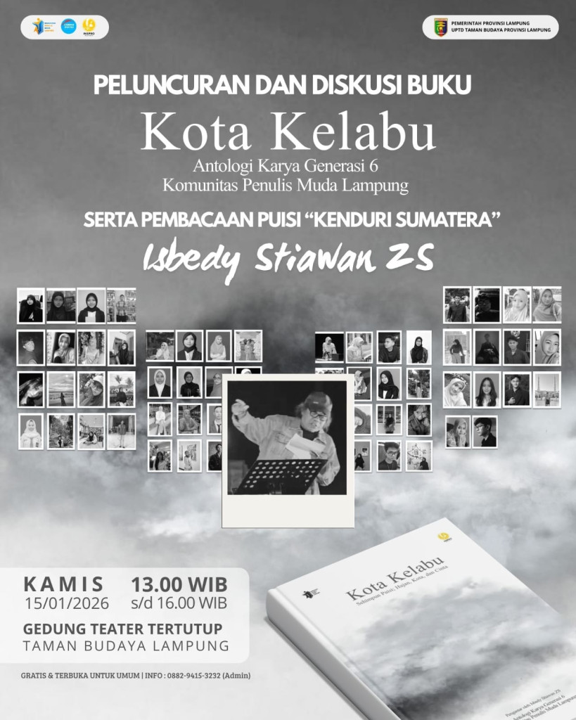INSIDE POLITIK- Dunia sastra Lampung kembali bergeliat di awal 2026. Antologi puisi “Kota Kelabu” resmi diluncurkan bersamaan dengan pembacaan puisi dari buku terbaru “Kenduri Sumatera” karya Isbedy Stiawan ZS. Agenda sastra ini digelar di Gedung Teater Tertutup Taman Budaya Lampung (GTT TBL), Kamis, 15 Januari 2026, dan menjadi ruang temu antara penyair senior dan generasi muda Lampung.